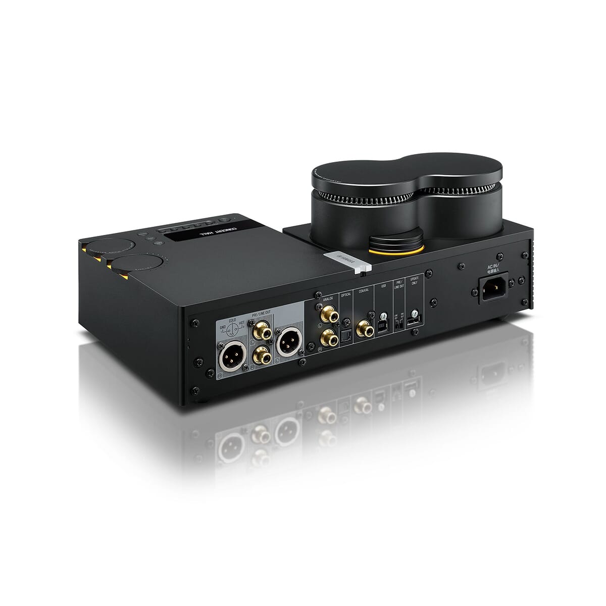 For å eliminere eventuelle skadelige virkninger av eksterne og interne vibrasjoner på lydsignalene har vi gitt enheten en robust konstruksjon som kombinerer et originalt designkonsept med deler med høy stabilitet. Et ekstrudert aluminiumspanel med 8 mm tykkelse utgjør den L-formede toppflaten, mens den naturlig vibrerende toroide transformatoren er montert fast på en 2 mm tykk stålplate. Enda sterkere støtte sikres av et tykt frontpanel, et dobbelt bakpanel og en unik husdesign med et bunndeksel på enden. Dette kraftige huset undertrykker unødvendige vibrasjoner, noe som gir mulighet for kraftig, men smidig lavfrekvent reproduksjon og lar deg føle den kraftige energien og ekte realismen i musikken.