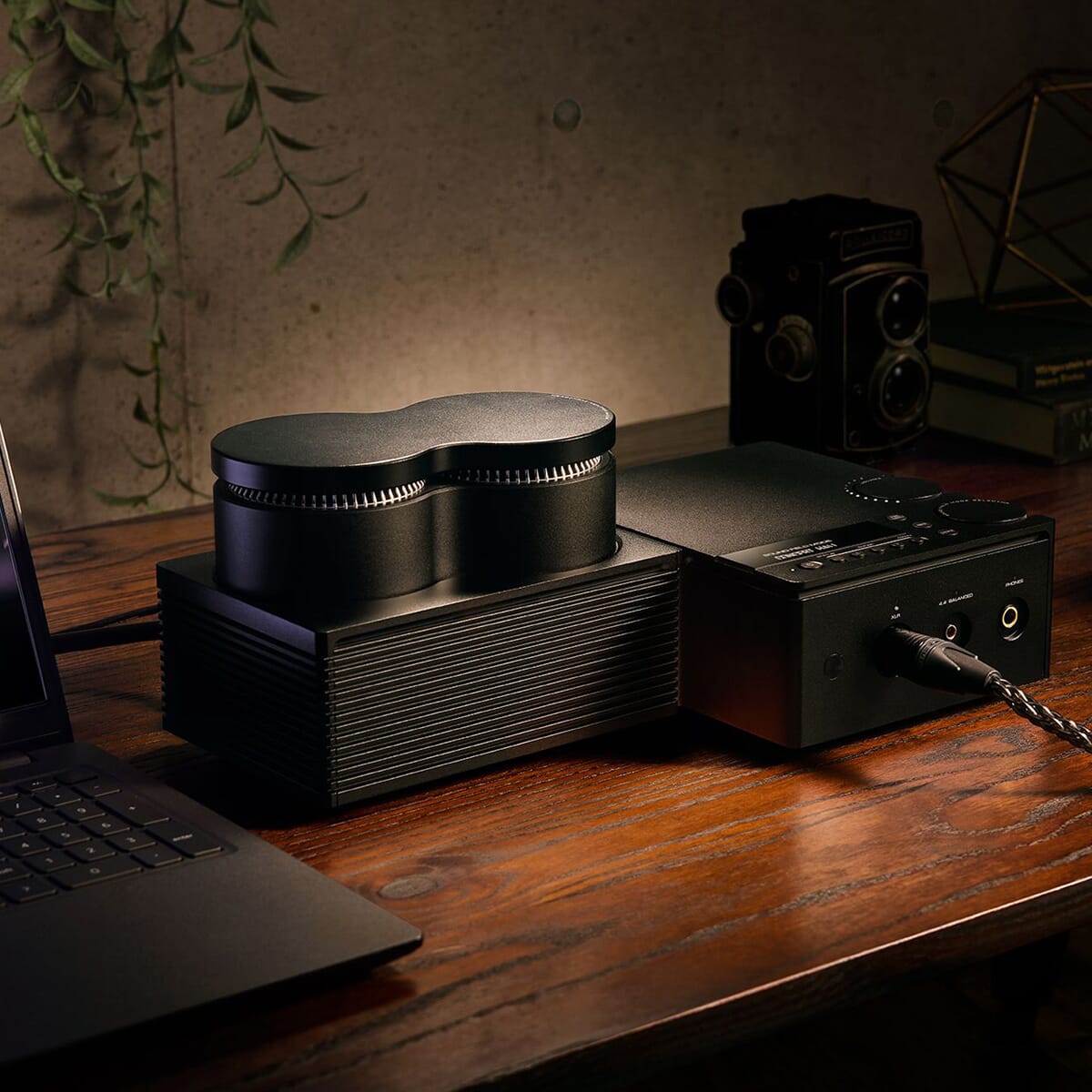 Den karakteristiske L-formede HA-L7A støttes av fem koniske stålføtter i hvert hjørne av chassiset, med dempere mellom hver fot og bunnpanelet som effektivt undertrykker enhver vibrasjon for fast og stabil støtte selv på et skrivebord eller bordplate. I kombinasjon med den tunge konstruksjonen på 5,3 kg jobber alle elementene sammen for effektivt å eliminere uønskede vibrasjoner for å oppnå fokusert og realistisk lydgjengivelse.