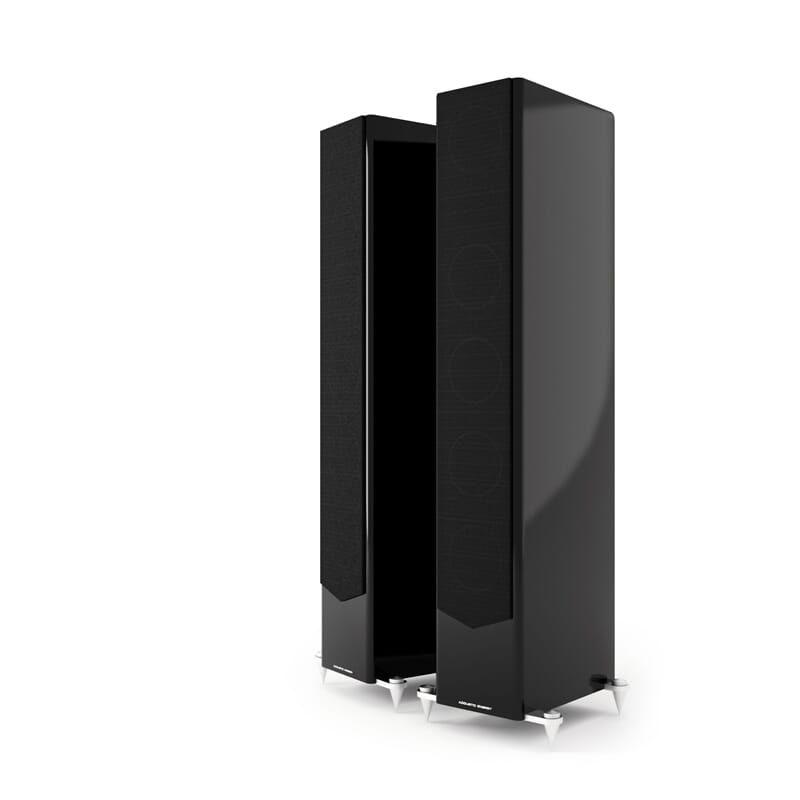 The slim-line cabinets are finished in Piano Gloss Black, Piano Gloss White or American Walnut wood veneer finishes. Solid Aluminium bars are supplied to ensure rigid floor-coupling and maximum stability, whilst the stiffness of